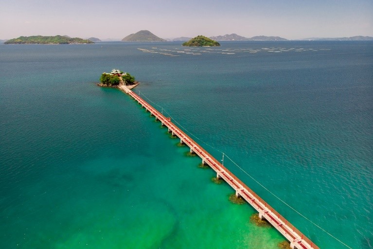 荘内半島(しょうないはんとう)は、三豊市北西部にある半島で北側は備讃瀬戸、西側は燧灘(ひうちなだ)が広がっています。また、三崎半島とも呼ばれます。半島の中ほどにある、船越と大浜を結ぶあたりはかつて海であり、先の部分は浦島と呼ばれていました。その後、陸繋島(りくけいとう)が発達し、半島となりましたが、船越の地名は島であったときの運河状態の際に船が通っていた名残りといわています。従って、この荘内半島には、浦島太郎に関する地名が数多く残されています。