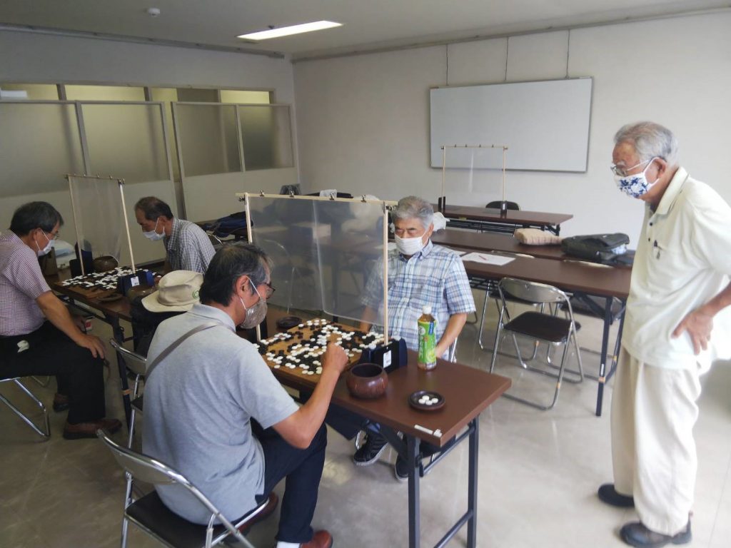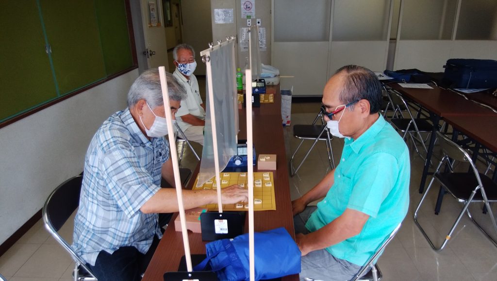③ 現在、草津市のなごみの里が閉鎖中の為、今回より会場を大津公民館に変更して開催することとなりました。ただし、写真のように厳格なコロナ対策をしての対局です。