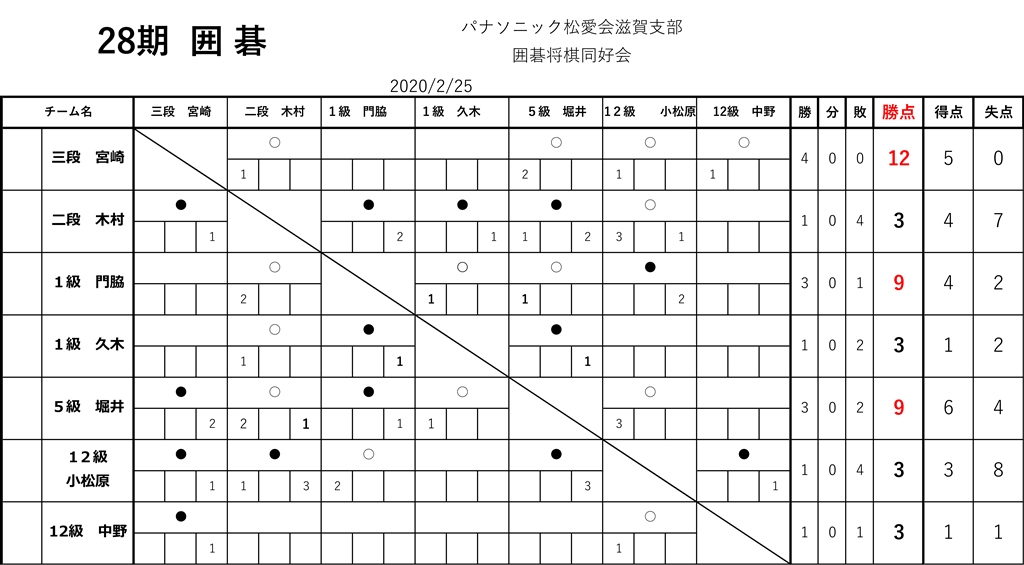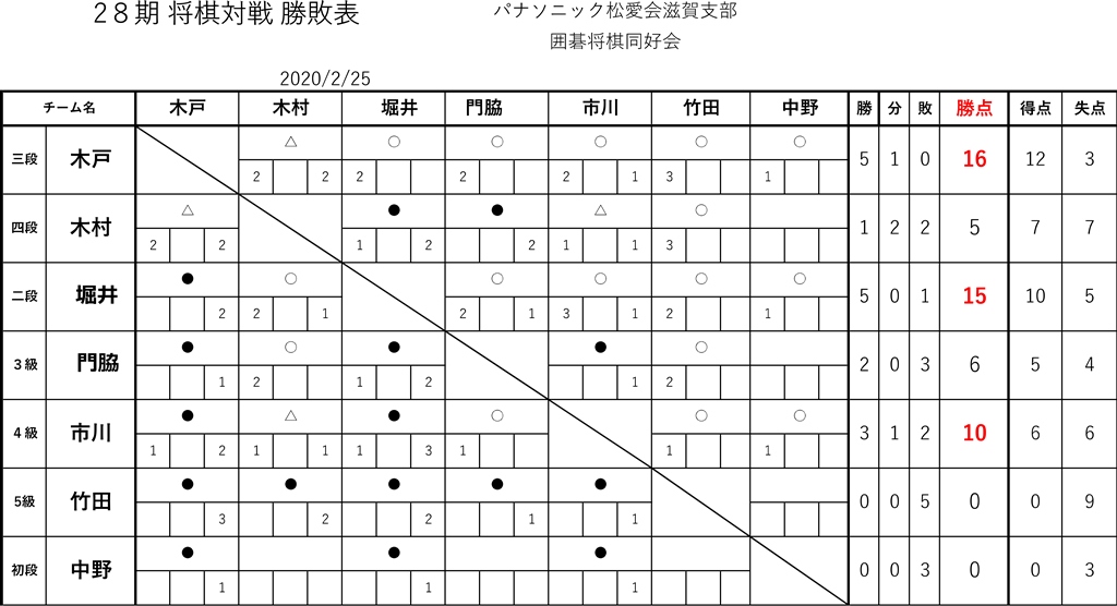 2020.02.26 未分類 囲碁将棋同好会対戦202002 囲碁将棋同好会 ◆囲碁・将棋同好会成績表 ◆将棋の部 第28期 対戦勝敗表 (2020年2月) 将棋第28期の成績 2020年2月 ◆囲碁の部 第28期 対戦勝敗表 (2020年2月) 囲碁第28期の成績 2020年2月 ◆第28期出欠表 (2020年2月) 2020年2月の出席 投稿者: hanni 未分類 コメント: 0 第28期 2020年2月 囲碁・将棋同好会を開催しまし…前の記事 硬式テニス同好会 2020年2月の練習会を開催しました次の記事