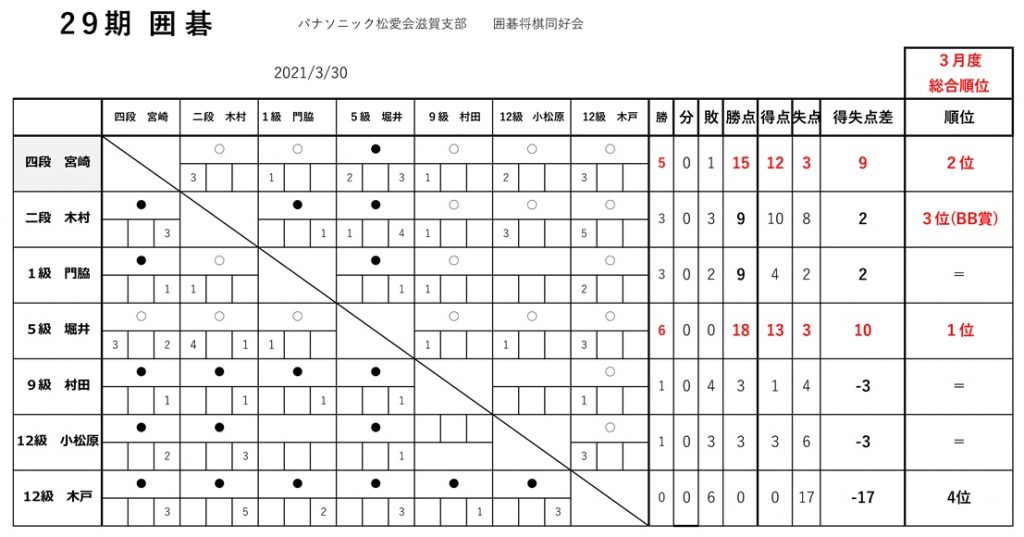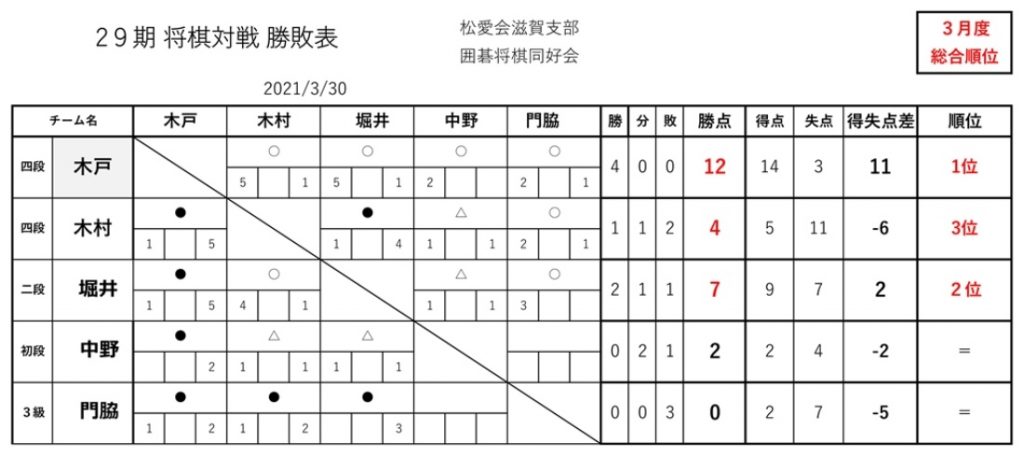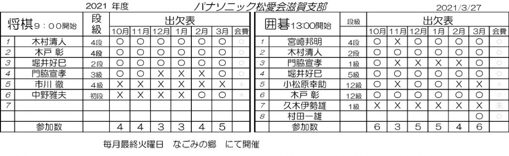 2021.03.31 囲碁・将棋同好会 活動紹介 囲碁将棋同好会対戦202103 29期 囲碁将棋同好会 ◆囲碁・将棋同好会成績表 ◆将棋の部 第29期 対戦勝敗表 (2021年3月) ◆囲碁の部 第29期 対戦勝敗表 (2021年3月) ◆第29期出欠表 (2021年3月) 投稿者: hanni 囲碁・将棋同好会 活動紹介 コメント: 0 湖東・湖北グラウンドゴルフ愛好会 2021年3月 第2…前の記事 第29期 2021年3月 囲碁・将棋同好会を開催しまし…次の記事