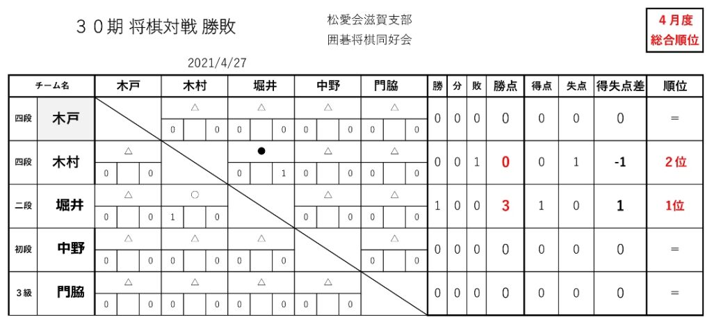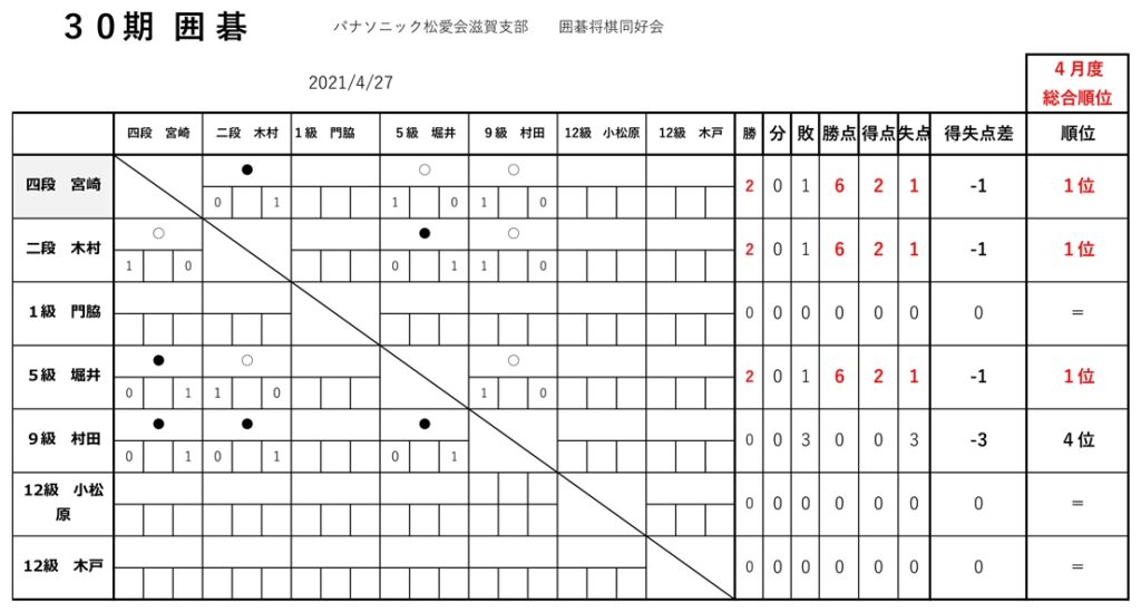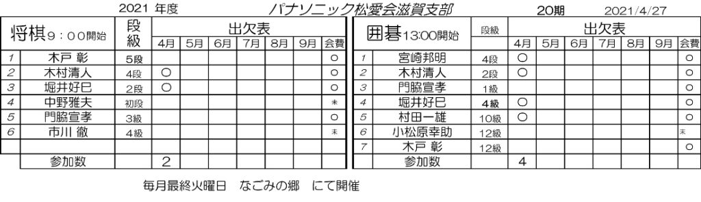 2021.04.29 囲碁・将棋同好会 活動紹介, 囲碁将棋同好会対戦表 囲碁将棋同好会対戦202104 30期 囲碁将棋同好会 ◆囲碁・将棋同好会成績表 ◆将棋の部 第309期 対戦勝敗表 (2021年4月) ◆囲碁の部 第30期 対戦勝敗表 (2021年4月) ◆第30期出欠表 (2021年4月) 投稿者: hanni 囲碁・将棋同好会 活動紹介, 囲碁将棋同好会対戦表 コメント: 0 ゴルフ同好会 歴代成績と競技の様子前の記事 第30期 2021年4月 囲碁・将棋同好会を開催しまし…次の記事