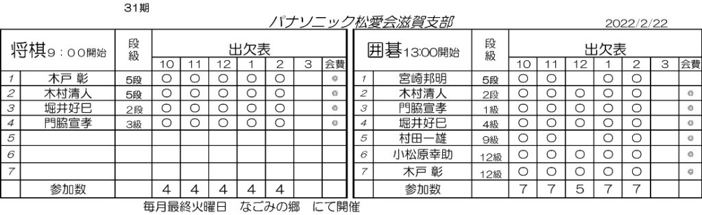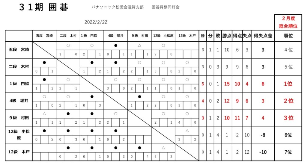 ◆囲碁の部 第31期 対戦勝敗表 (2022年2月)