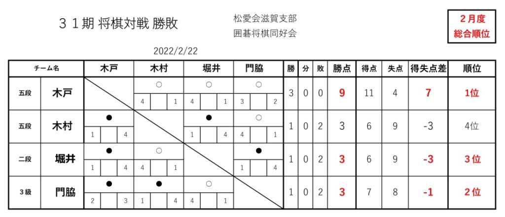 ◆将棋の部 第31期 対戦勝敗表 (2022年2月)