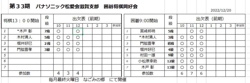 2022.12.21 囲碁将棋同好会対戦表 囲碁将棋同好会対戦202212 33期 囲碁将棋同好会 ◆囲碁・将棋同好会成績表 ◆将棋の部 第33期 対戦勝敗表 (2022年12月) ◆囲碁の部 第33期 対戦勝敗表 (2022年12月) ◆第33期出欠表 (2022年12月) 投稿者: hanni 囲碁将棋同好会対戦表 コメント: 0 2025年度 湖の辺歩こう会実施予定表前の記事 第33期 2022年12月 囲碁・将棋同好会を開催しま…次の記事