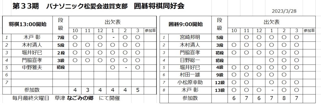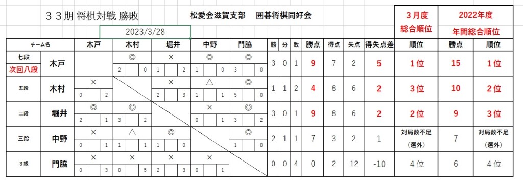 ◆将棋の部 第33期 対戦勝敗表 (2023年3月)