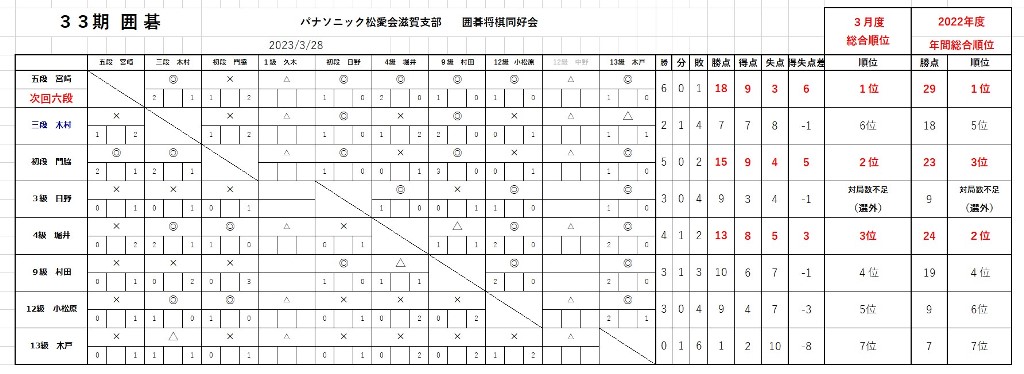 ◆囲碁の部 第33期 対戦勝敗表 (2023年3月)
