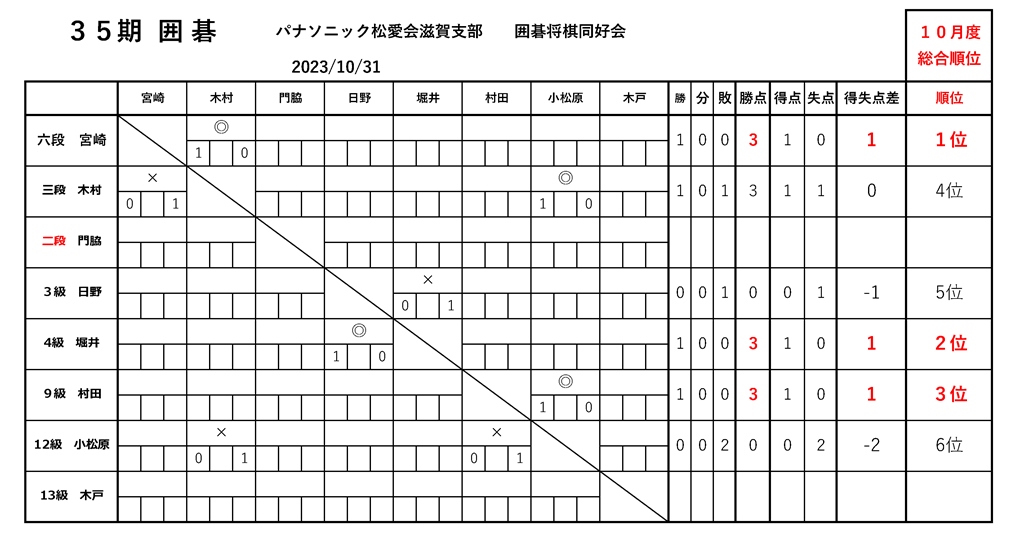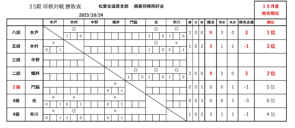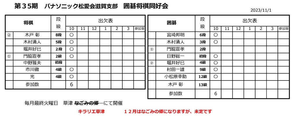 2023.11.2 囲碁将棋同好会対戦表 囲碁将棋同好会対戦202310 35期 囲碁将棋同好会 ◆囲碁・将棋同好会成績表 ◆囲碁の部 第35期 対戦勝敗表 (2023年10月) 囲碁勝敗R5年10月 ◆将棋の部 第35期 対戦勝敗表 (2023年10月) 将棋勝敗R5年10月 ◆第35期出欠表 (2023年10月) 囲碁将棋R5年10月出欠 投稿者: hanni 囲碁将棋同好会対戦表 コメント: 0 滋賀だより 2023年11-12月号前の記事 第35期 2023年10月 囲碁・将棋同好会を開催しま…次の記事