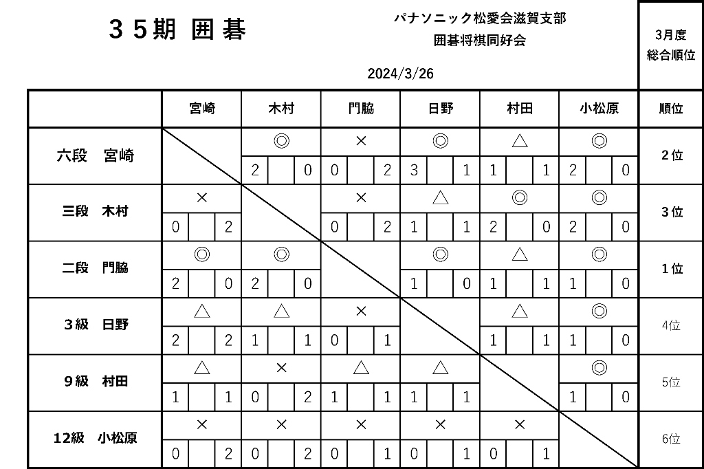 囲碁の部 第35期 対戦勝敗表 (2024年3月)