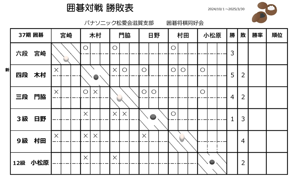 囲碁の部 第37期 対戦勝敗表 (2024年11月)