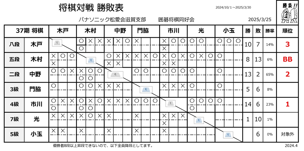 ◆将棋の部 第37期 対戦勝敗表 (2025年3月)