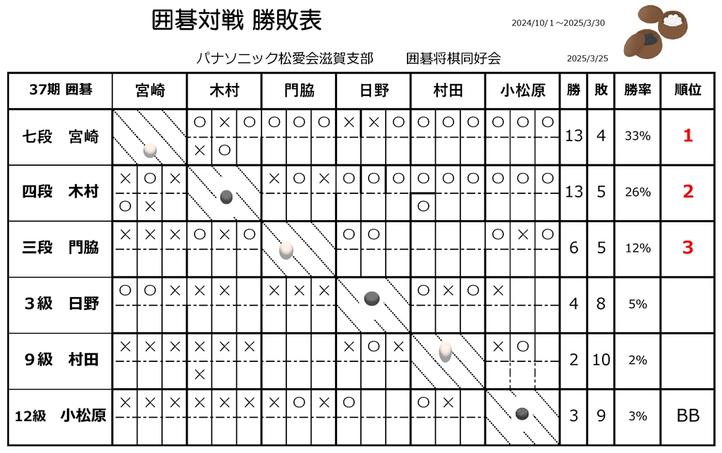 囲碁の部 第37期 対戦勝敗表 (2025年3月)