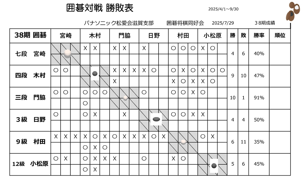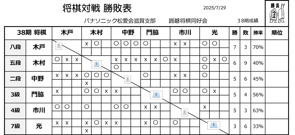 2025.07.30 囲碁将棋同好会対戦表 38期囲碁将棋同好会7月対戦成績 囲碁将棋同好会 ◆囲碁・将棋同好会成績表 ◆囲碁の部 第38期 対戦勝敗表 (2025年7月) ◆将棋の部 第38期 対戦勝敗表 (2025年7月) 投稿者: hanni 囲碁将棋同好会対戦表 コメント: 0 フォトウォーク同好会 第85回 例会報告前の記事 第38期 2025年度7月 囲碁・将棋同好会を開催しま…次の記事