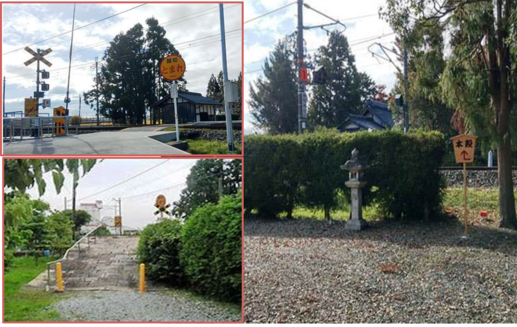 - ⑥ 第二鳥居をくぐり、左に折れ線路の踏切を渡って本堂へ