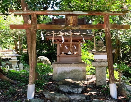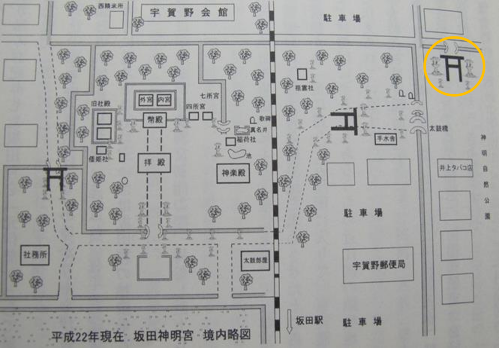 宇賀野の地図で散策した近所の神社です。わが小生の幼児期は「宮さん 宮さん」と呼んでいました。現在小生は宮さんの総代をしていて、その宮さんの名前は坂田神明宮(上の写真の赤の破線枠)です。由来は以下の通りです。