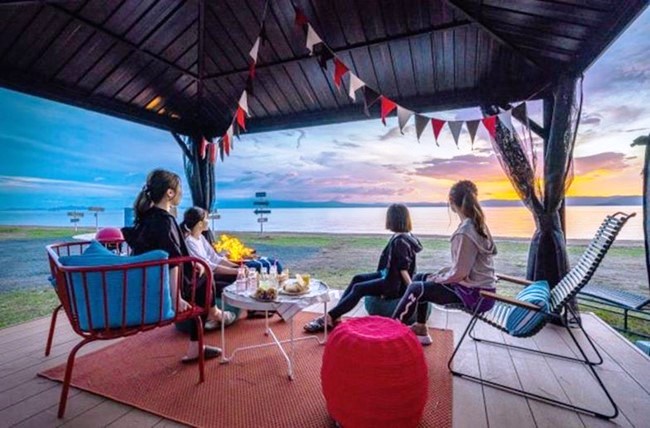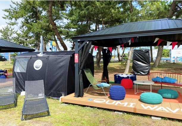 この琵琶湖畔の場所を小生が所属する宇賀野老人クラブがキャンプ場として夏のシーズン中に開設をしていました。その場所が奥伊吹観光会社により開発され、今年の2021年の夏、「琵琶湖」の「波・風・景色」にふれるビーチリゾート[OUMI WEVE」としてオープンしました。