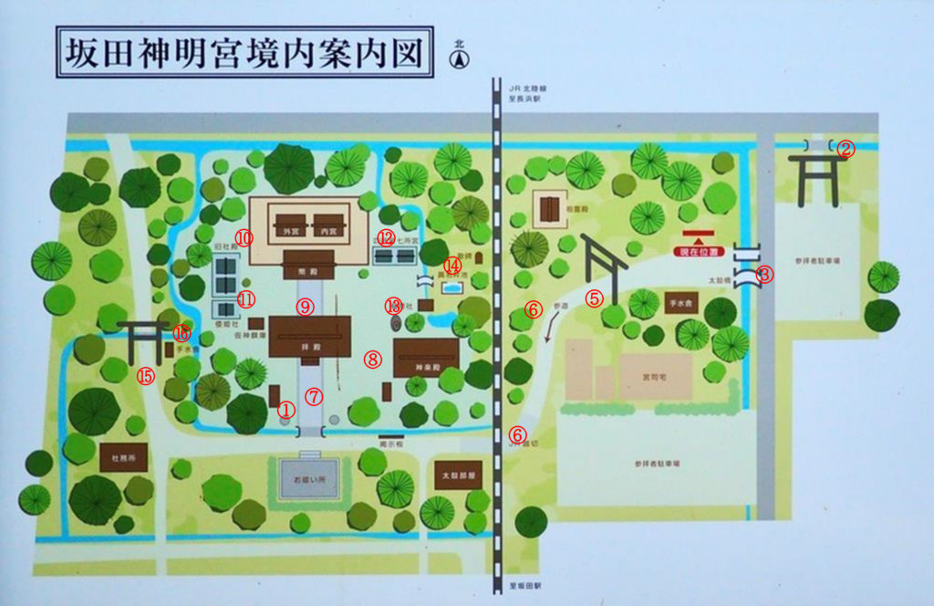 下の図が、現在の坂田神明宮の境内図です。それでは坂田神明宮を紹介していきましょう。