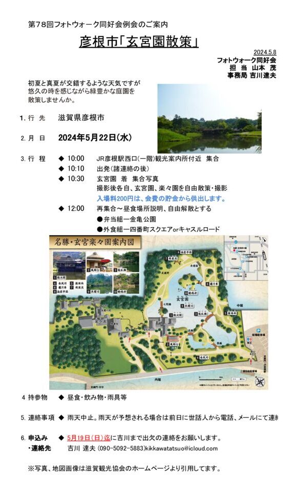 2024.05.16 未分類 フォトウォーク同好会 2024年5月 第78回 例会案内 彦根市「玄宮園散策」(5月22日) 投稿者: kikkawa 未分類 コメント: 0 グラウンドゴルフ同好会2024年5月 第212回月例大…前の記事 第249回 麻雀同好会 2023年度および第83期2回…次の記事