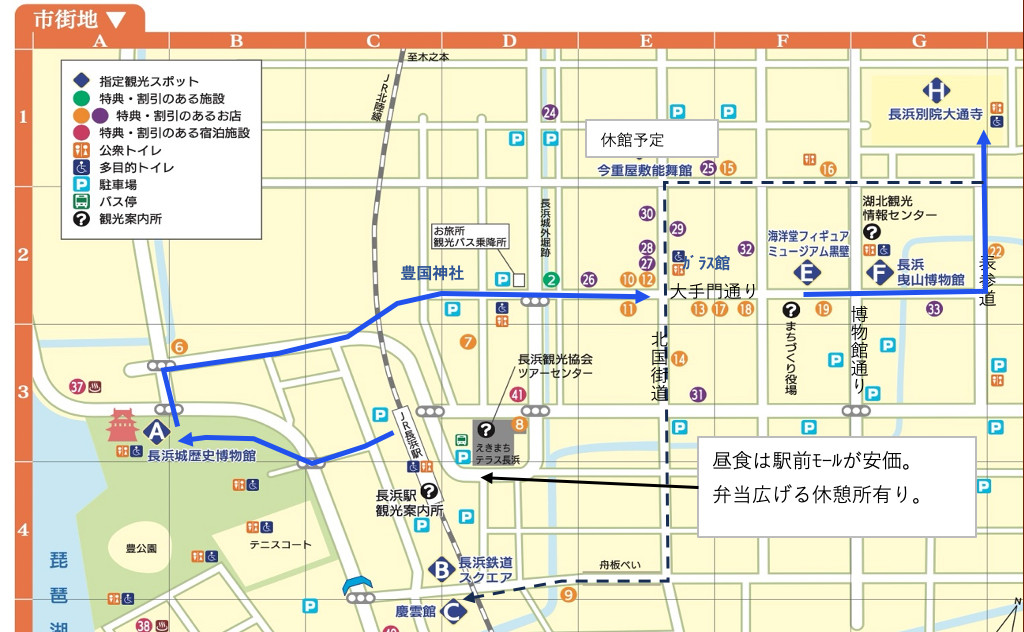 ※長浜おでかけパスポート(1500円)で下図A〜Hに入館可能も曳山博物館は当日臨時休業だった。