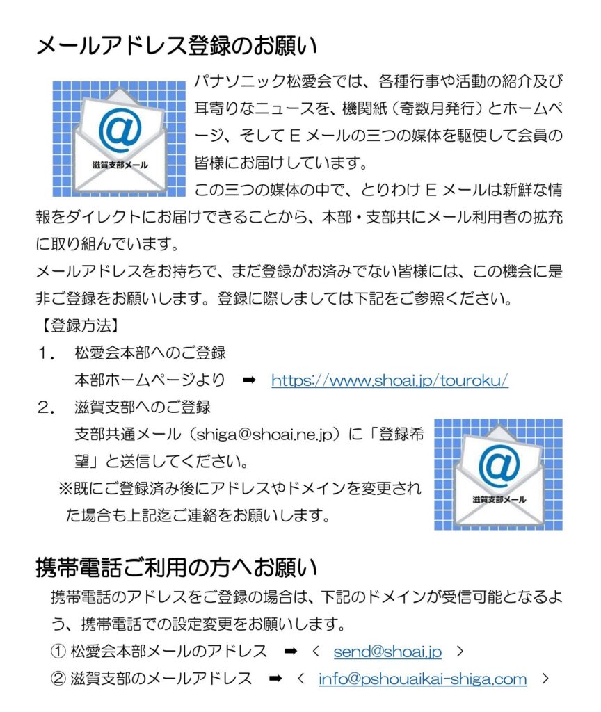 メールアドレス滋賀支部がヤフーメールに送られていましてややこしくなっていました上記にお願いします。