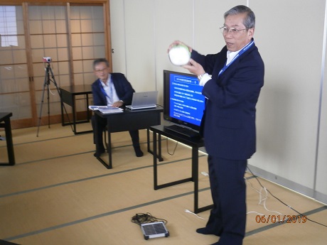 ⑤『みんなで“AKARI”アクション』の紹介(パナソニックソーラーランタンの実演)・・・・・植木支部長