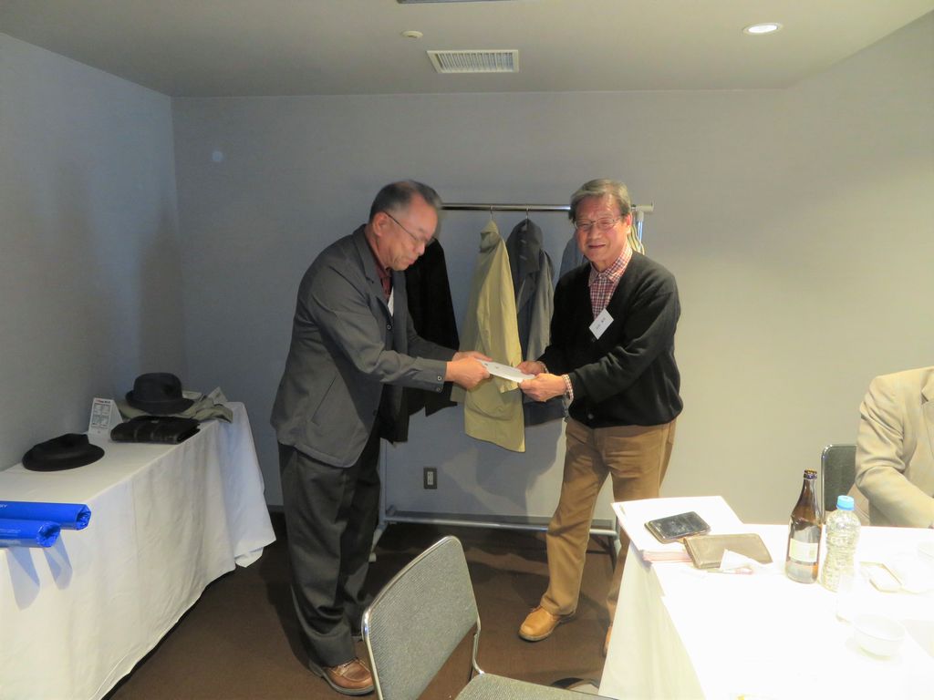 5.懇談会に先立ち阿倍敏男さんの金婚記念品も八木支部長より贈呈。