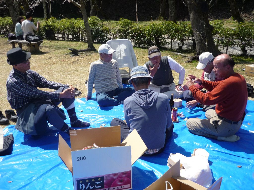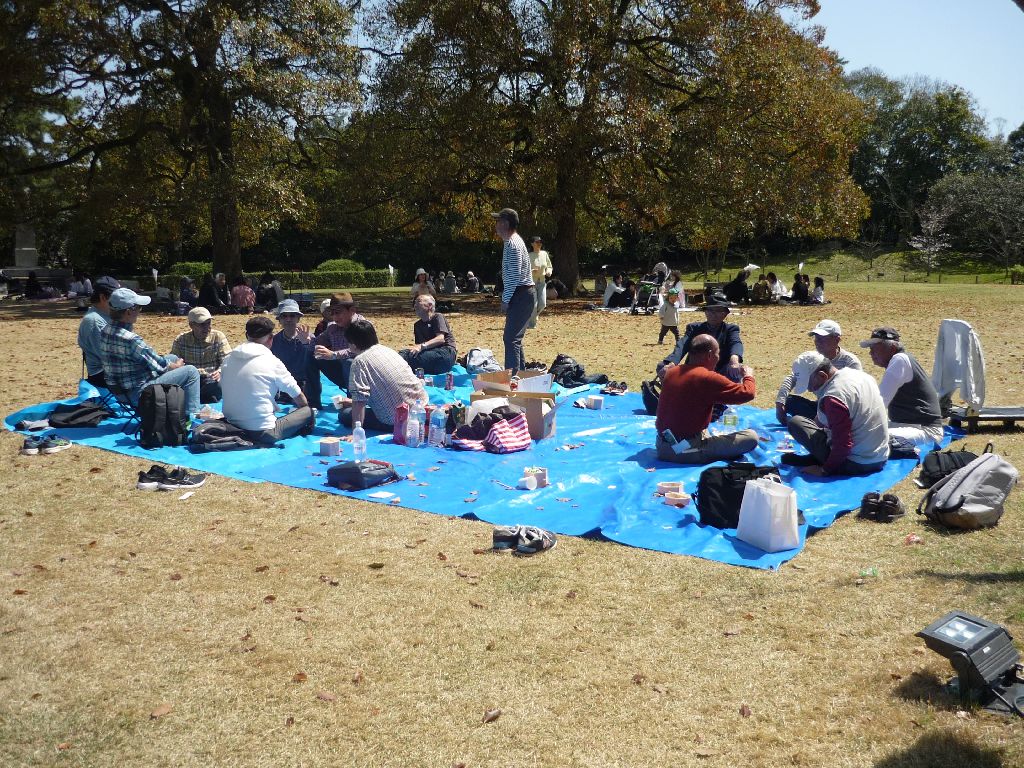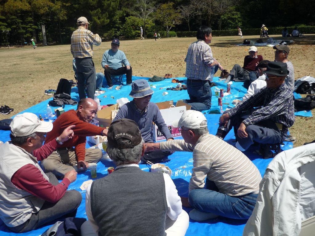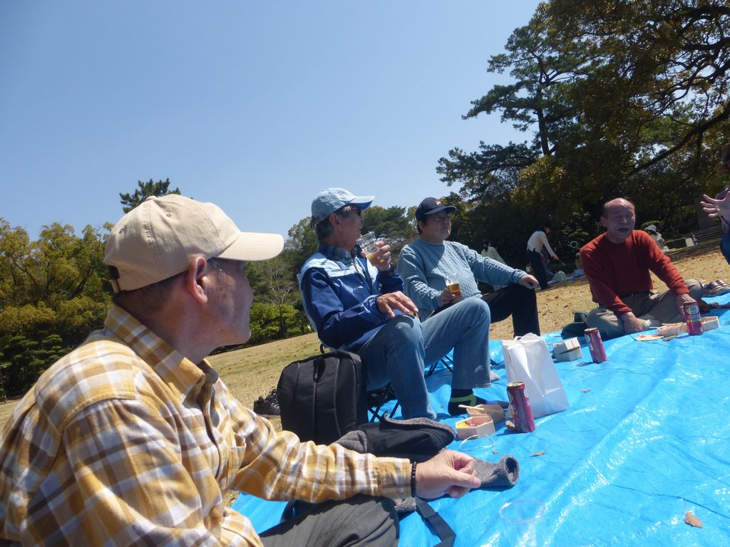 ・ブルーシートの真ん中にお酒等の飲み物を置き、17名が車座になってお弁当を肴にビールや日本酒・焼酎等を飲みながら、歓談の声が聞こえ笑顔がはじけています。