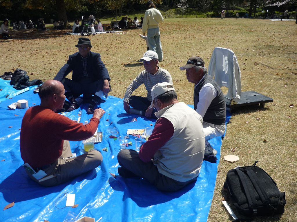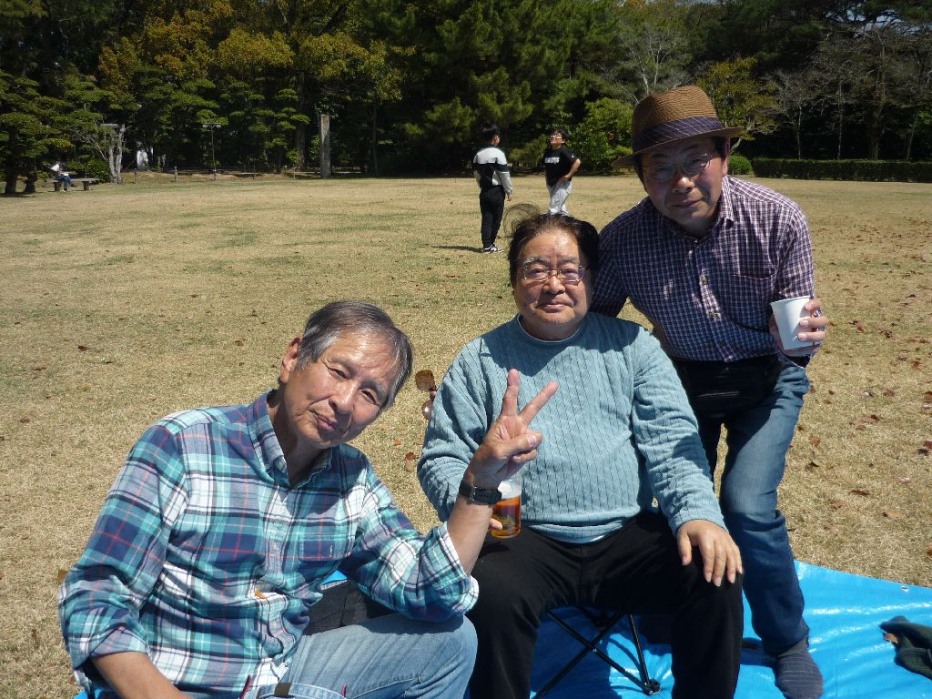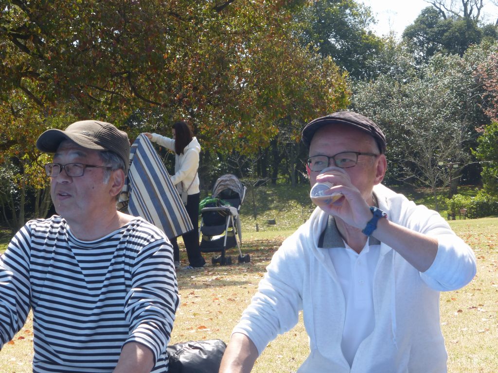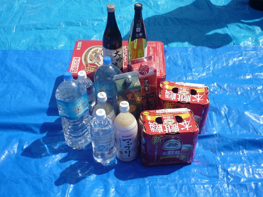 ・ブルーシートの真ん中にお酒等の飲み物を置き、17名が車座になってお弁当を肴にビールや日本酒・焼酎等を飲みながら、歓談の声が聞こえ笑顔がはじけています。
