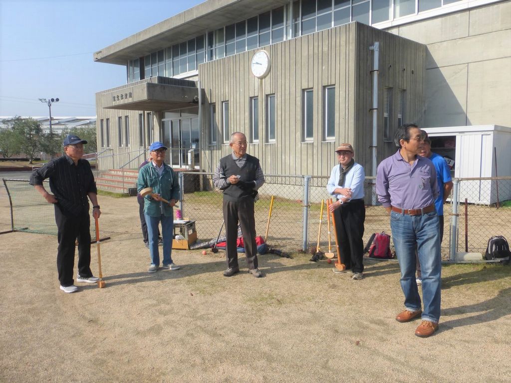 ①グランドゴルフ世話役高本さんより競技実施要領の説明