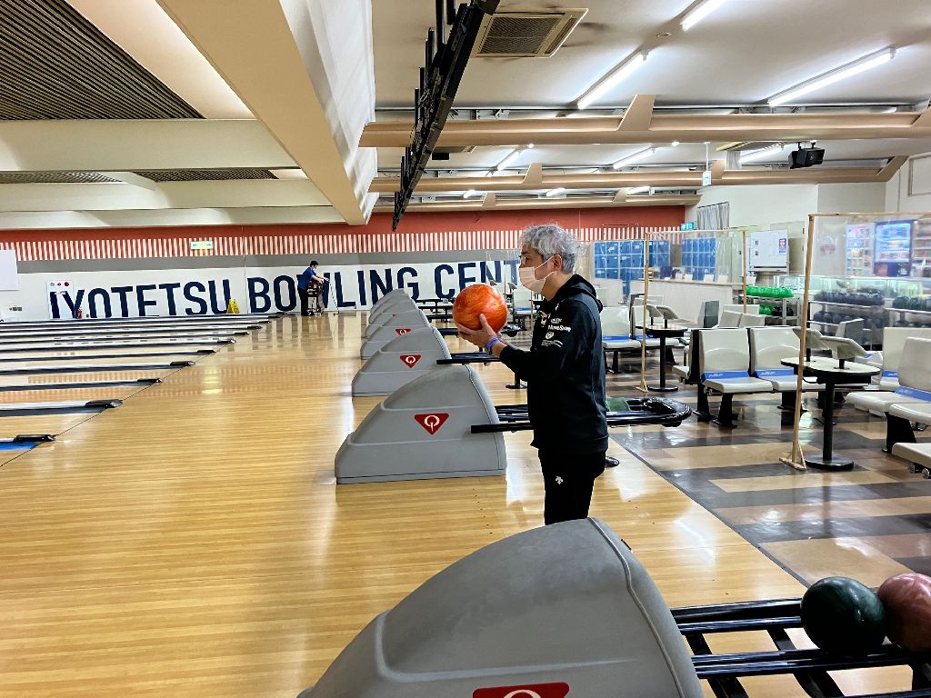 今回、武本さんがオープン参加され、合計5名で開始しました。森さんが練習ボールで投球前に「10番ピンのみ狙います」「次の投球は7番ピンのみ狙います」と宣言し、その通りの見事な投球に全員ビックリ♬