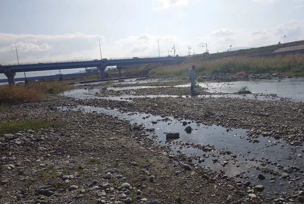 6.最近の松山地域は雨があまり降らず、水不足の影響で河川の水位も低くなっており、活動も従来よりも広範囲になりました。川底を歩いて渡る際に底のゴミや、向こう岸まで渡り広くゴミを集める事が出来ました。