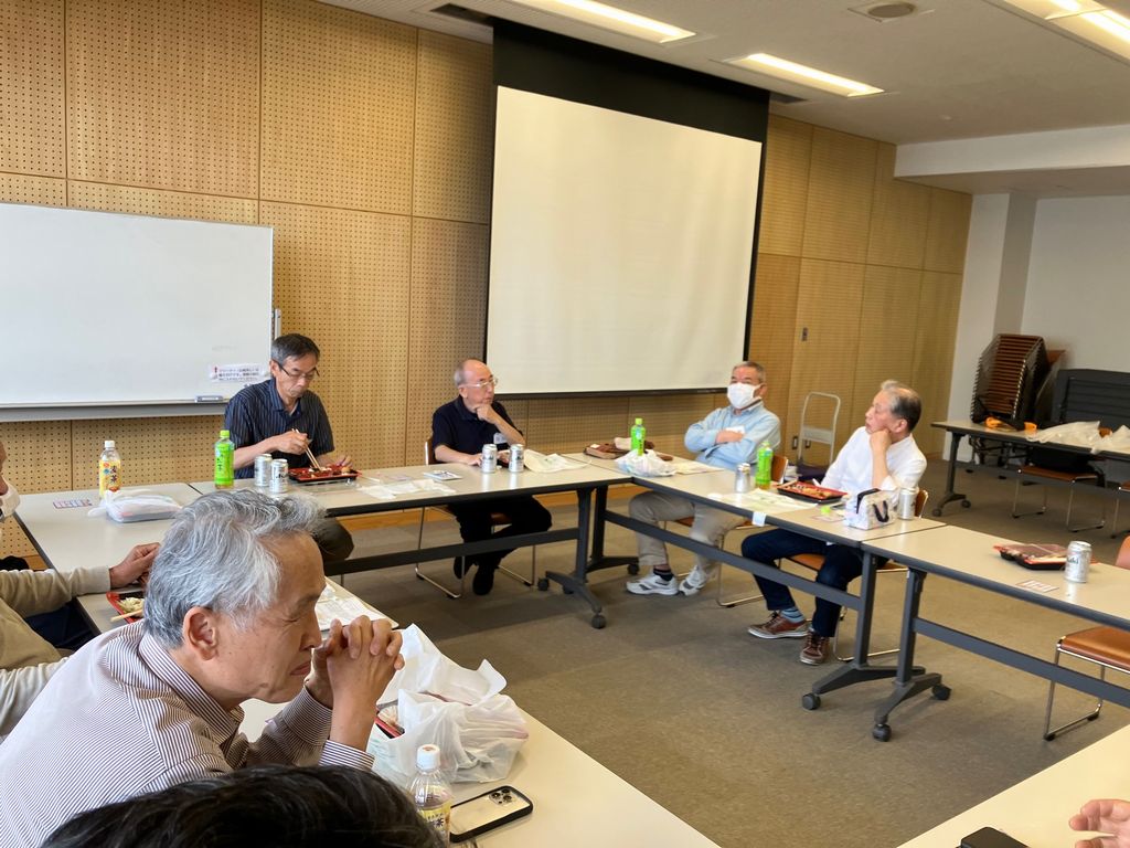 各自自由に近くの方々と懇談したのち、初参加の2名(昨年度転入された佐伯さん、新入会された賀川さん)よりお話をもらいました。またひさしぶりに参加の青野さんや寺崎さんも近況などお話をしてもらいました。
