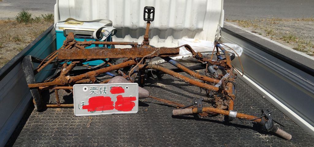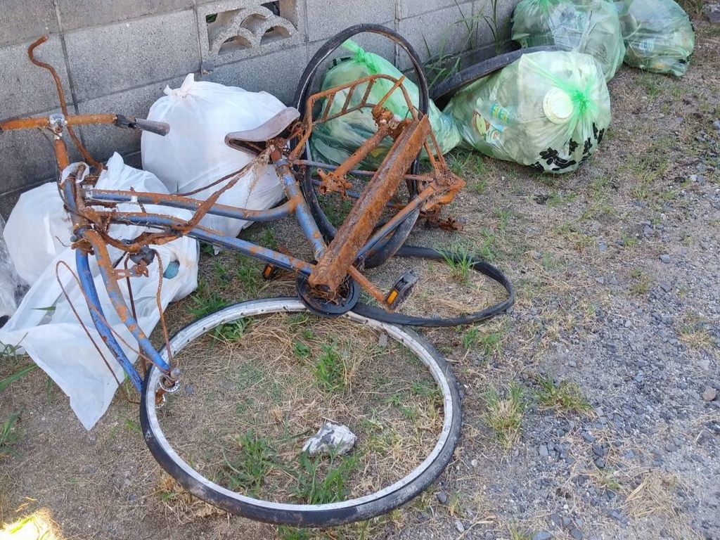 3.作業開始 ; 今回は開始場所を下流から始め、上流に向けて移動をしながら収集作業を行いました。河川が連日の猛暑で川の水位も低くなっていて、川底が見える場所があり、その辺りと草むらをメインに作業を行いました。川底辺りでは、空き缶や瓶などが見つかりました。また、草むら中から錆びた自転車や車のナンバープレートが出てきたのには驚きました。(おそらく不法投棄か上流から流れてきたように思われます。ナンバープレートはのちに警察に届けました)