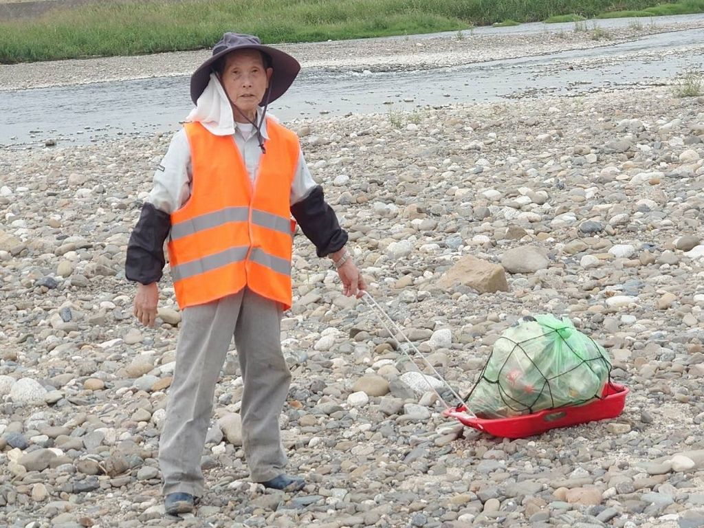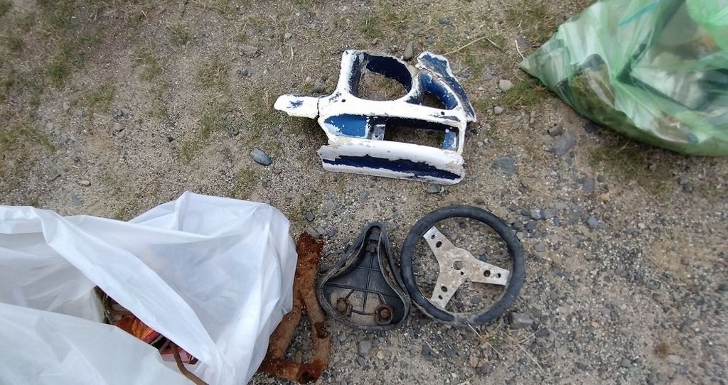 河川の水位も低くなっていて、川底が見えたので、川沿いと生い茂った草むらの範囲の作業となりました。下流の草むらを探していると、ペットボトルをはじめ、ナイロン、ビニール類が草に絡んでありました。また先月と立て続けに車のパーツである錆びた車のハンドル自転車サドルが出てきました。