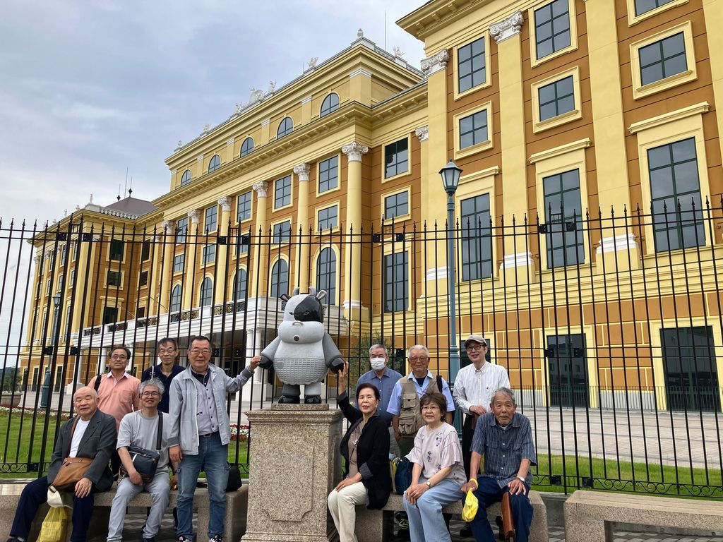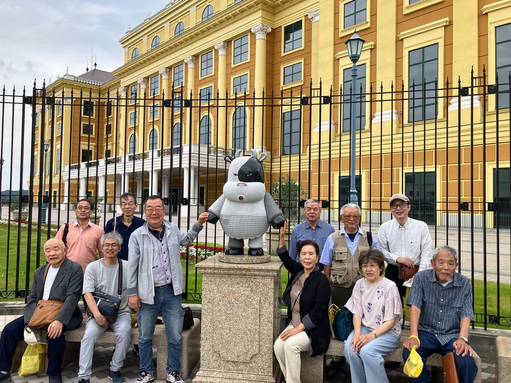 終わりに建物を出てからCMで有名なバンコちゃんの像のところに行き、宮殿建物をバックにした写真を撮っていただきました。建物内部の写真はNGなのでありません。 工場見学参加者が喜んだお顔で写真撮影してくれました。