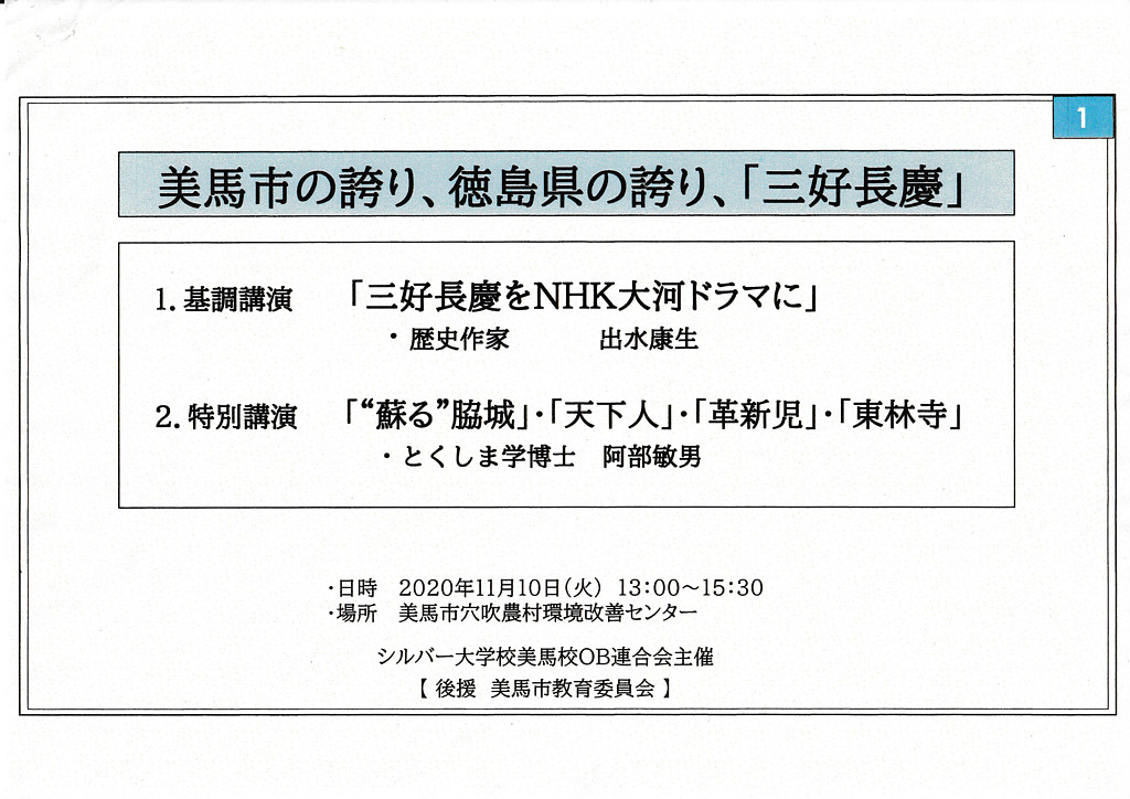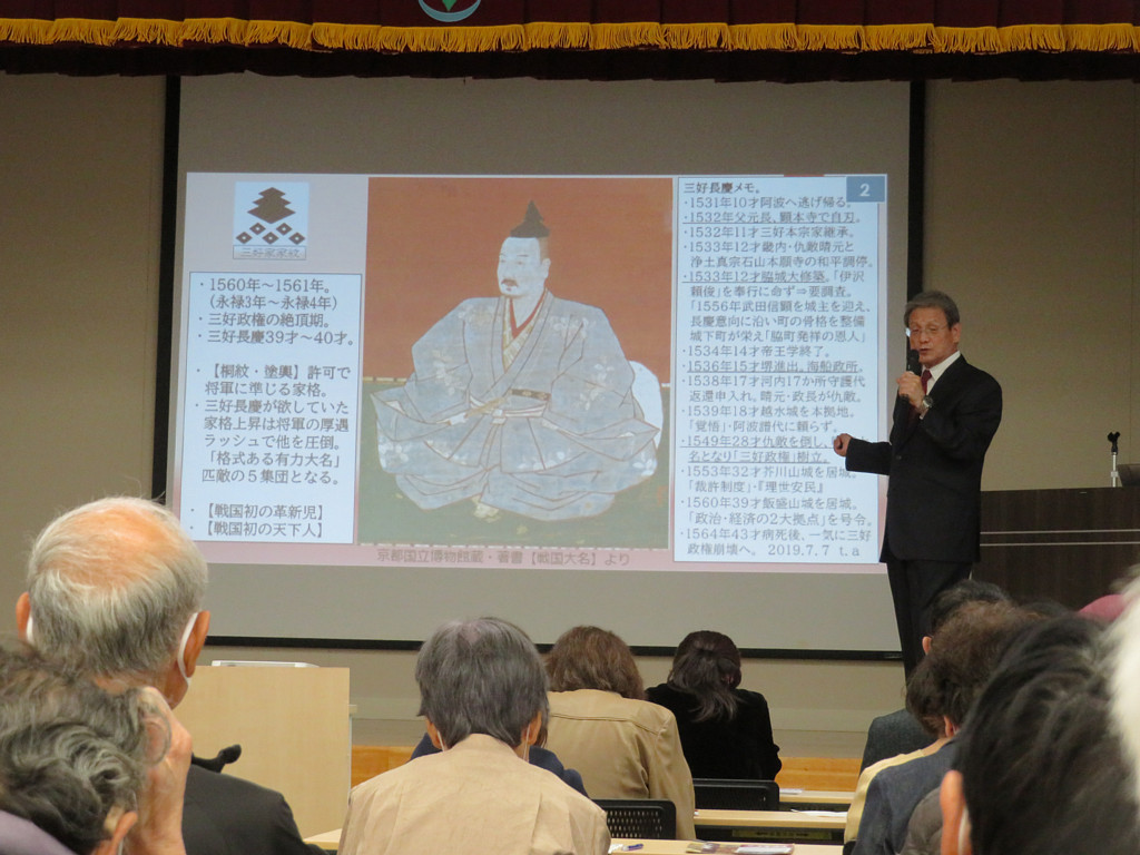 阿部会員はここ二年間徳島出身の戦国武将「三好長慶」の研究に没頭されていて、今回美馬市に於いて研究成果の講演会を開催されました。