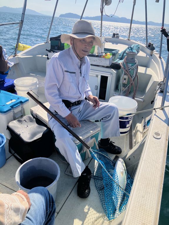 再度興居島沖に移動しなおしチャレンジ、松山空港の沖にも移動して15時半頃まで粘りました。ポツポツの当たりで追加で2本は釣ったものの初めてのハマチ釣りは釣りをしている時間よりも船で移動している時間が長いような感じで散々の結果となりました。 船頭さんによると20回に1回くらいの不漁の日となったようです。 世話役としてもクーラーに入りきれないほどを期待したのですが悔しい思いでした。