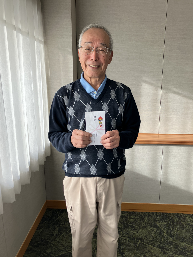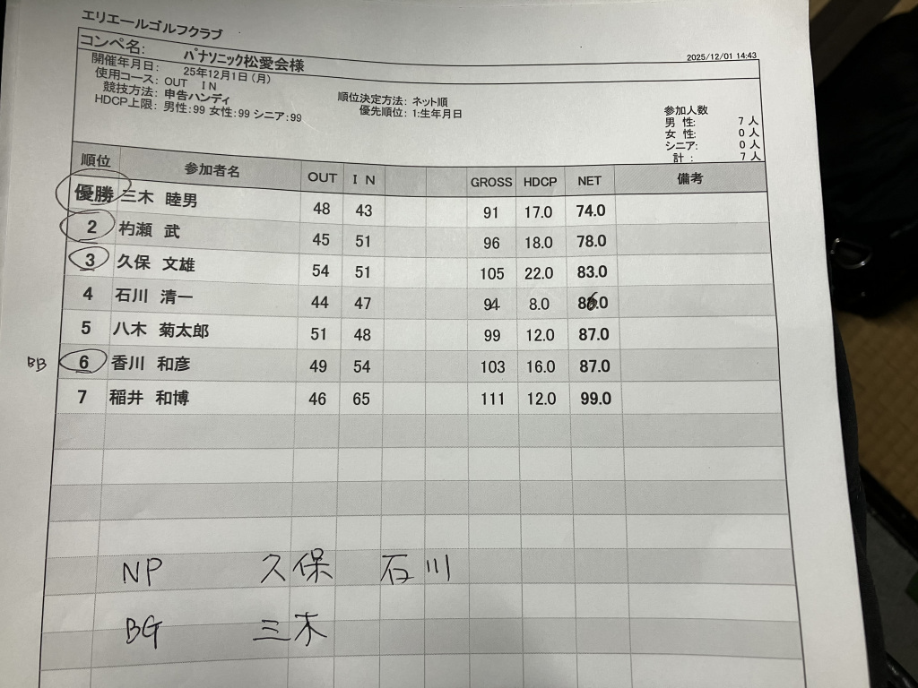 久しぶりの優勝でした。前半はなかなか内容もよかったのですが後半はガタガタしまして、8番までベスグロ争いをして同スコアだったのですが、9番でIさんが優しい気持ちでシャンクして池に入れ9たたいたので私がベスグロになりました。来年から新しい運営方法になっても今日のようなスコアが出せるよう頑張りたいと思います。