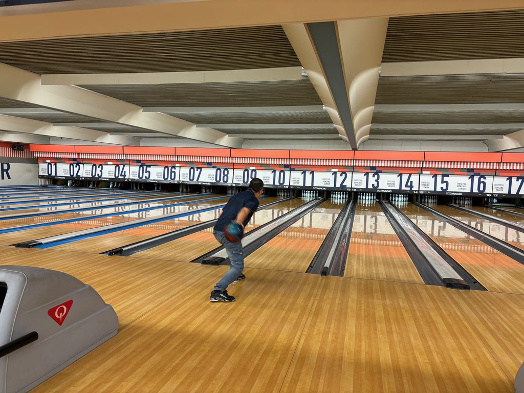 第一ゲーム開始:出足は全員ヘッドピンに当てて調子が良さそうでしたがスペアーに苦戦する展開になりました。その中で迫川さんがダブルストライク2個と1つのミスのみで197をマークし抜け出しました。