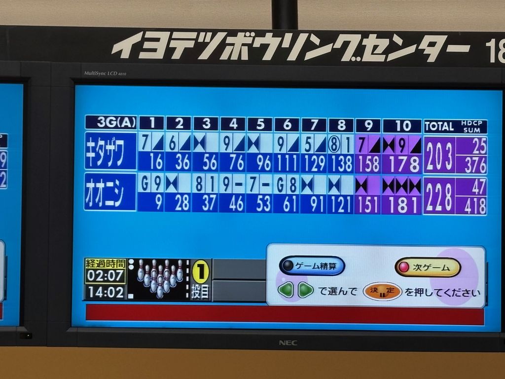 第一ゲーム開始:いきなり迫川さんがダブルを出し抜け出しましたが、スペアーの後ガターを2回だし? 又、北沢さんも7フレ迄ノーミスが2回のオープンミスを出してハイゲームを逃しました。 そんな中で武本さんがストライク3回、スペアー3回取り一気にTOPに立ちました。