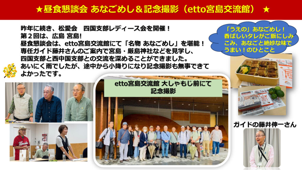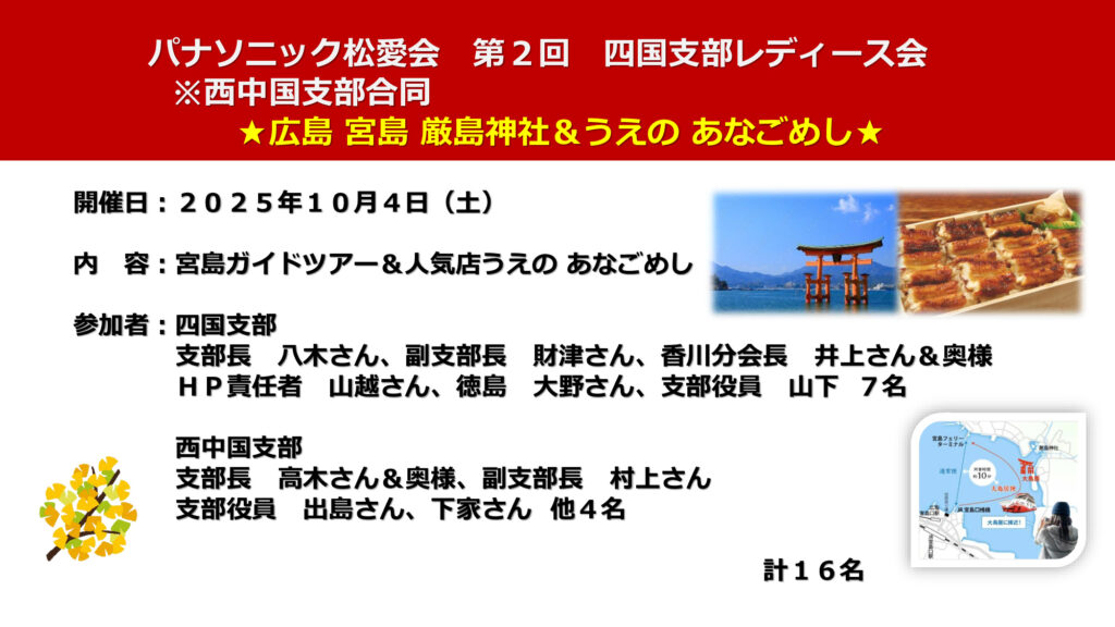 2025.10.4 女性懇談会, 支部の便り, 行事報告 パナソニック松愛会四国支部 第2回レディース会 下記の記事画像をクリックすると記事がPDFで見れます。 (pdfリーダーはこちらからダウンロード) 投稿者: yamagoshi 女性懇談会, 支部の便り, 行事報告 コメント: 0 第80回讃岐ボウル同好会活動報告前の記事 徳島分会 定例懇談会次の記事