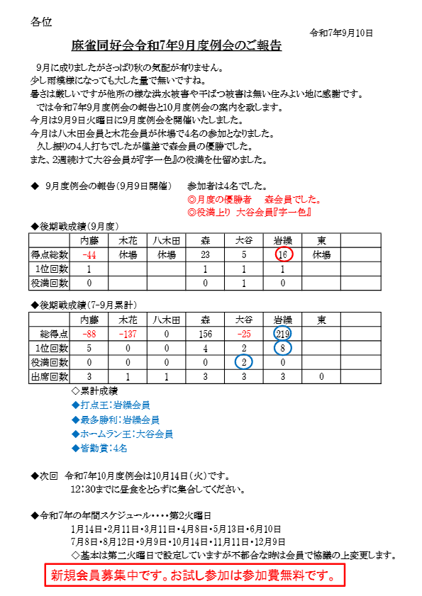 2025.09.9 麻雀同好会 麻雀同好会9月活動報告 報告書をクリックするとPDFで見れます(pdfリーダー必要) 写真をクリックすると拡大表示(表示後、左右の < > をクリックするとスライド表示) R7年9月例会 大谷会員・岩繰会員・内藤会員・森会員 役満を上がった大谷会員 大谷会員が上がった「字一色」 記事・写真:森源五 投稿者: yamagoshi 麻雀同好会 コメント: 0 愛媛地区 ボランティア おもちゃ病院(9月7日)前の記事 2025年度 愛媛分会 節目および新入会員懇親会次の記事