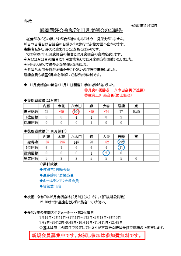 2025.11.11 同好会活動, 麻雀同好会 麻雀同好会11月活動報告 報告書をクリックするとPDFで見れます(pdfリーダー必要) 写真をクリックすると拡大表示(表示後、左右の < > をクリックするとスライド表示) 11月度例会参加者 第1卓 大谷会員・森会員・内藤会員 第2卓 八木田会員・木花会員・岩繰会員 国士無双を上がった森会員 森会員の国士無双 記事・写真:森源五 投稿者: yamagoshi 同好会活動, 麻雀同好会 コメント: 0 松愛会 四国ゴルフ部会 第8戦前の記事 第81回讃岐ボウル同好会活動報告次の記事