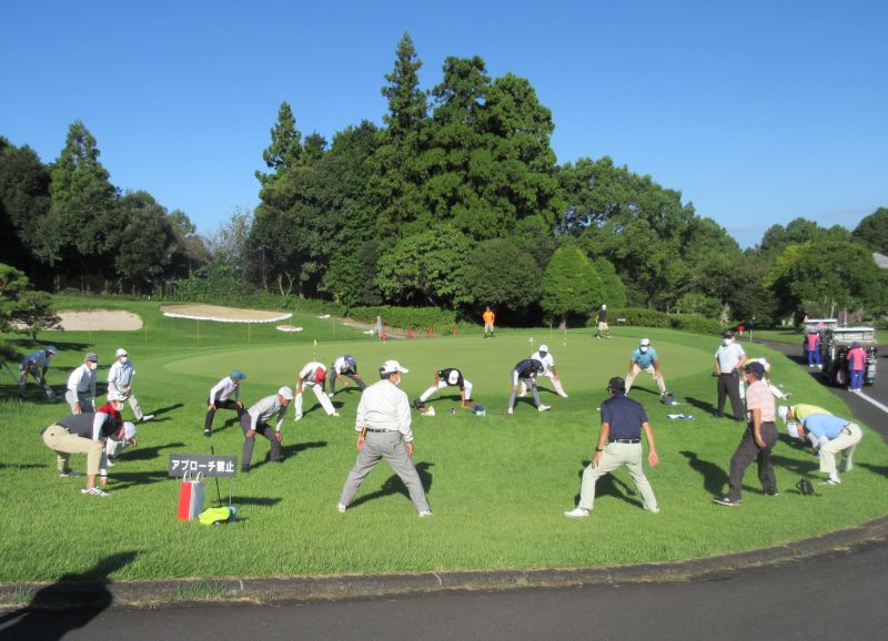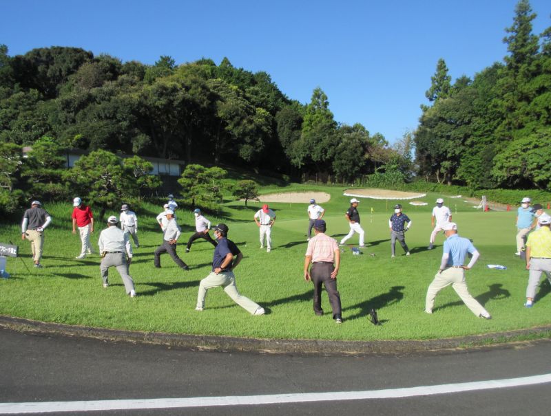 幹事から、コロナ感染防止対策の徹底や賞の披露のあと、寺澤さんのリードでストレッチ体操を行い、マスクを外して全員でカメラに収まり OUT/INに別れて白球を打って行った。