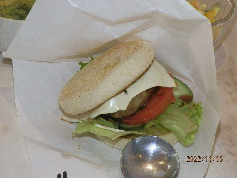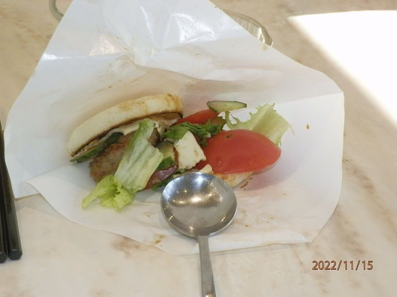 出来立てほやほやの料理を各テーブル毎に分かれて、試食(昼食)。量は多めのハンバーガーを口一杯にほおばりお腹いっぱい。味付けも良くなかなかの出来映えでした。(自己満足?)