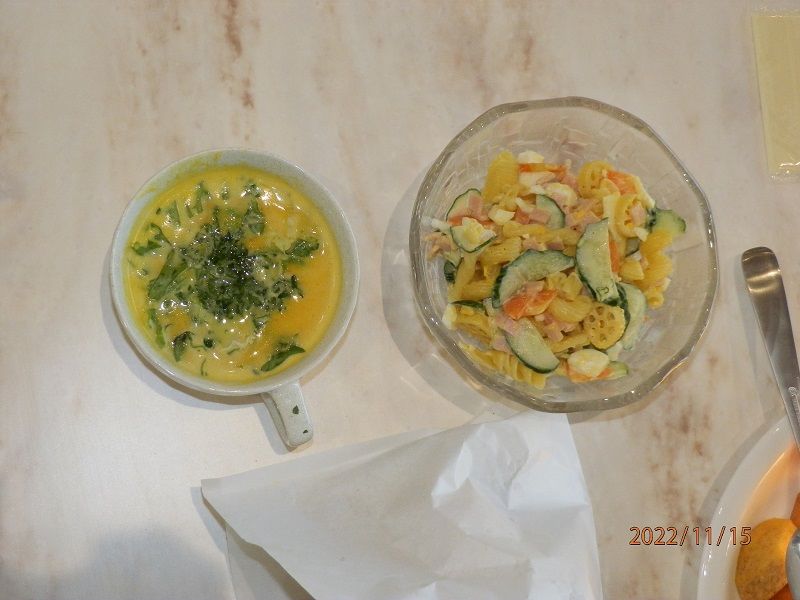今日の料理は、①子供に人気のハンバーガー ②カボチャのポタージュ ③マカロニサラダ の3品。