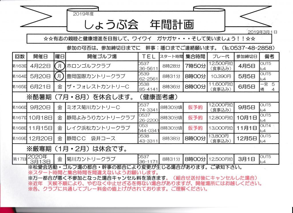 しょうぶ会の年間計画です ゴルフ場との打ち合わせで変更する場合があります幹事に確認を!