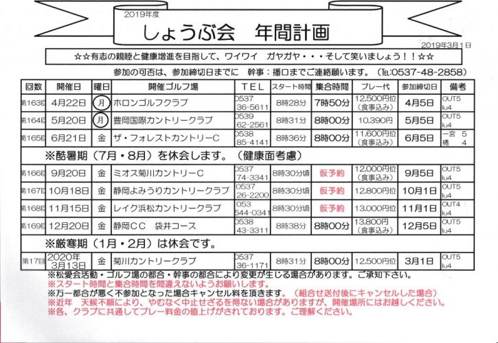 しょうぶ会の年間計画です ゴルフ場との打ち合わせで変更する場合があります幹事に確認を!