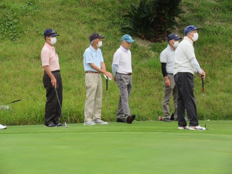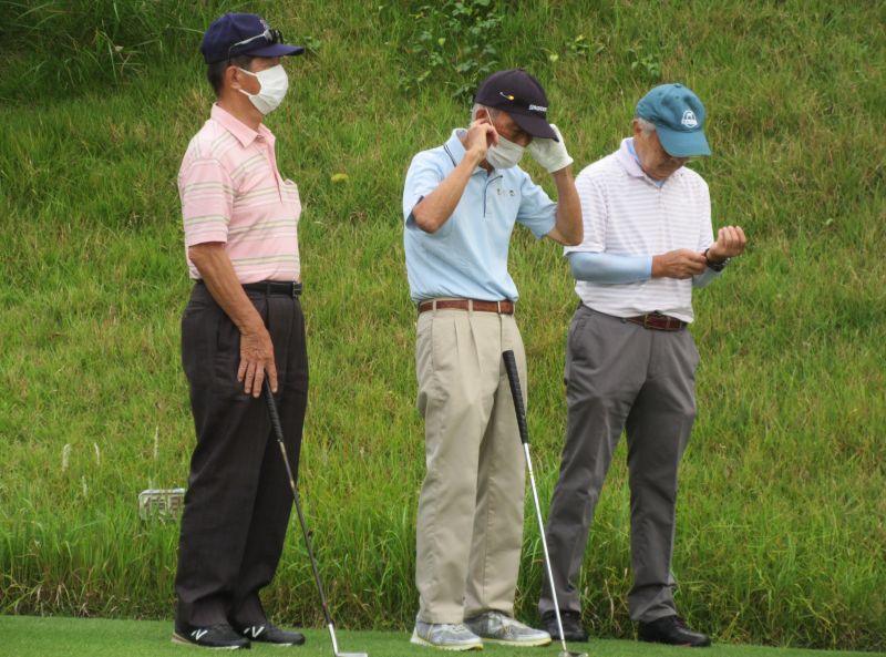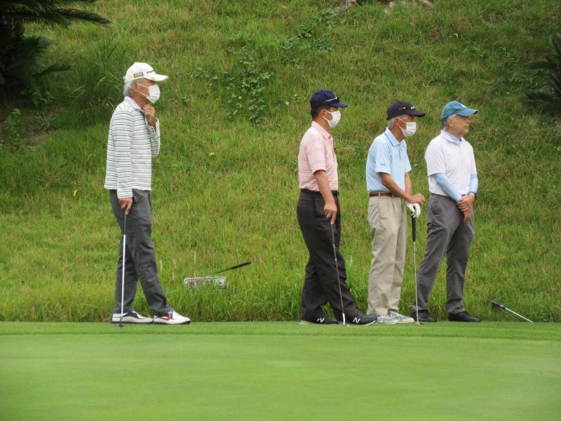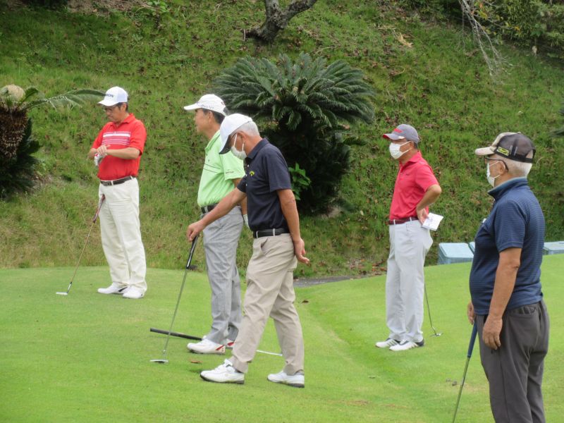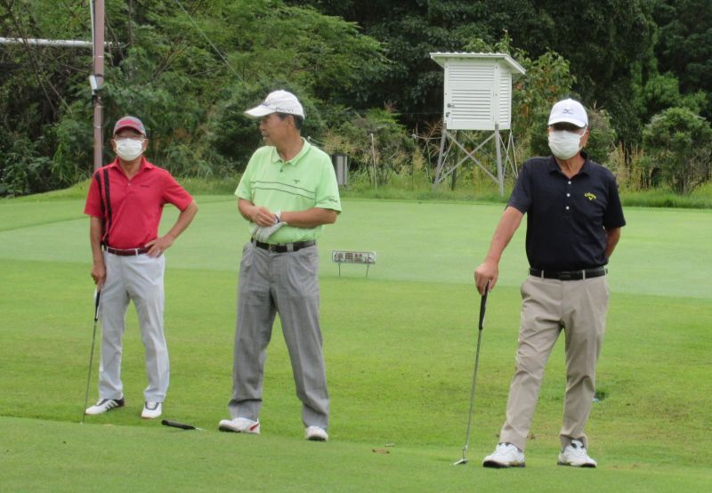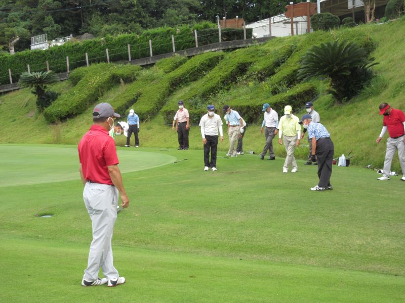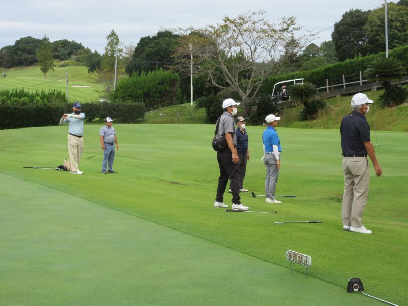 年間計画策定の際に、この日が東京オリンピック開催の可否により祭日・平日が分れる予測からゴルフ場と調整してどちらになっても平日料金扱いにすることを条件に設定・・結果はオリンピック開催により、平日扱いとなった。 当日は、雲が多いものの雨の心配はなく22名の参加者は時間前に集合し、練習に励んでいた。