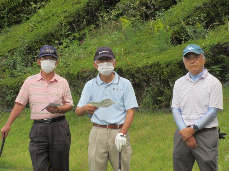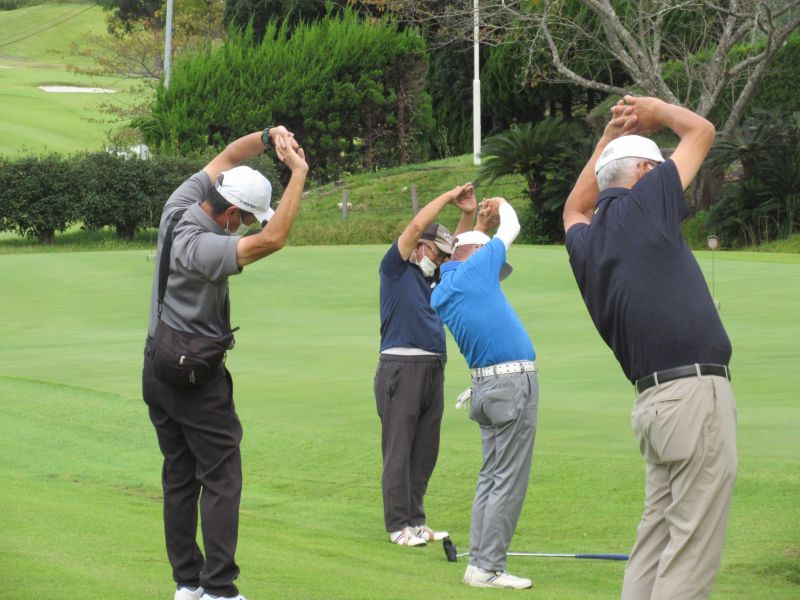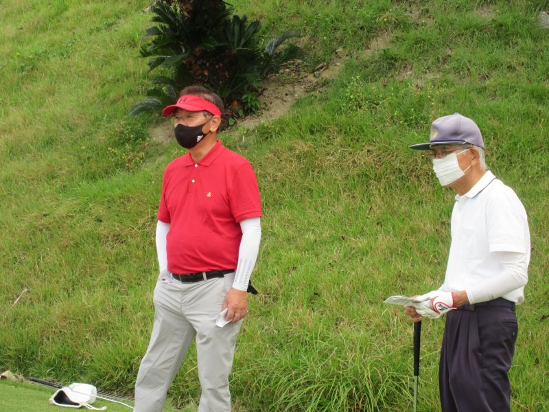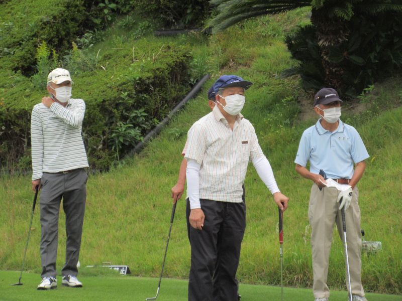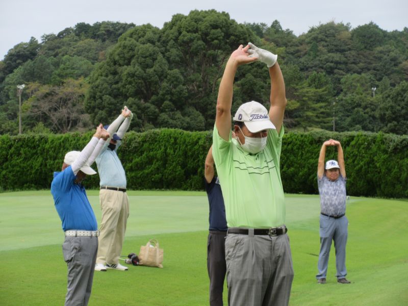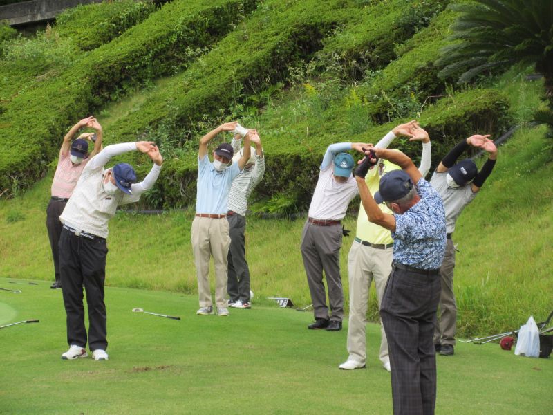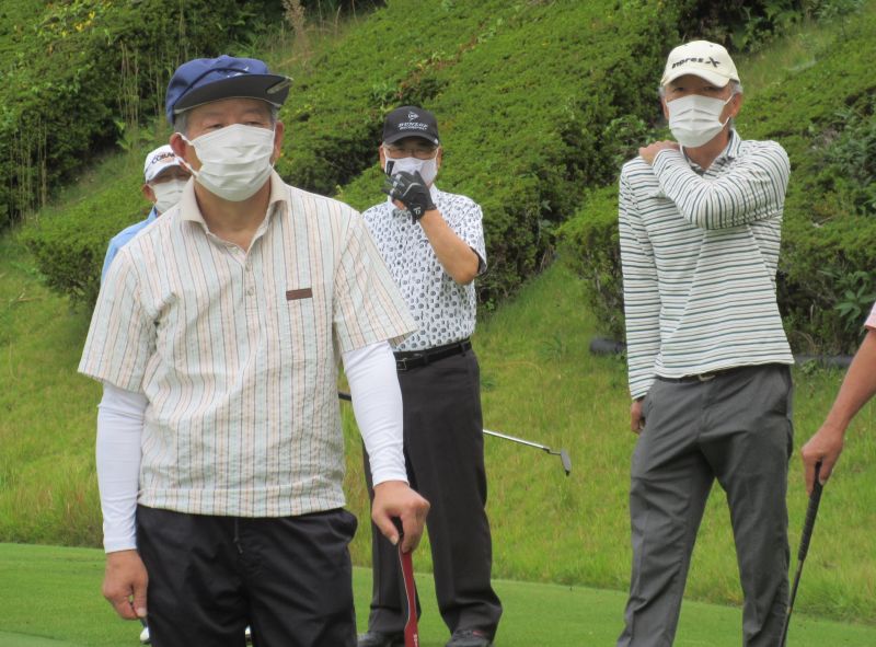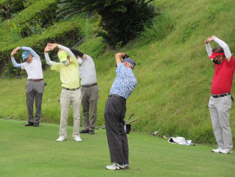 今回も、高木(善)さんの会長代行挨拶に始まり、幹事からコロナ感染防止への対策に万全を期すことや本日の賞の紹介、体操も行い集合写真撮影後 OUT/INに別れて急いでスタートホールへ!(実は、体操の途中でキャディが時間です!と呼びに来た為)