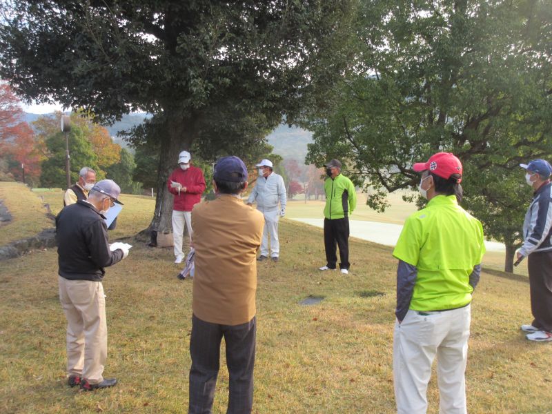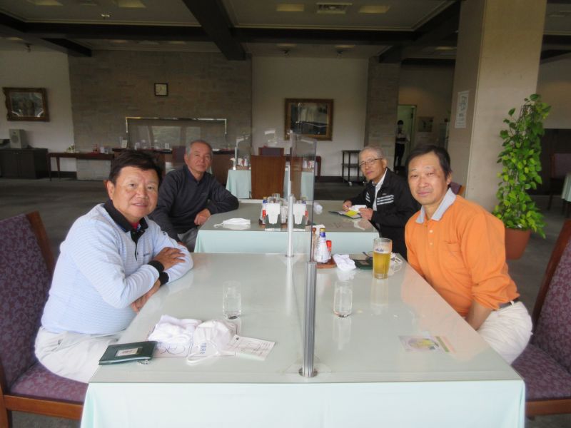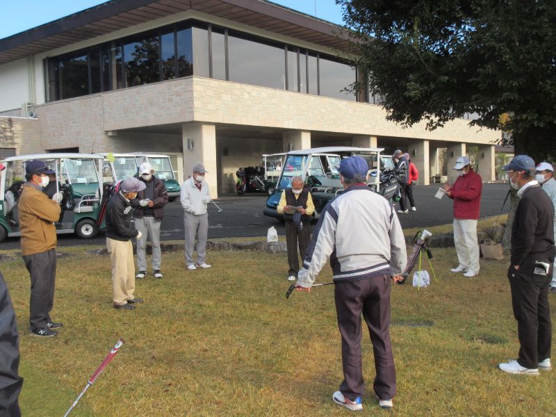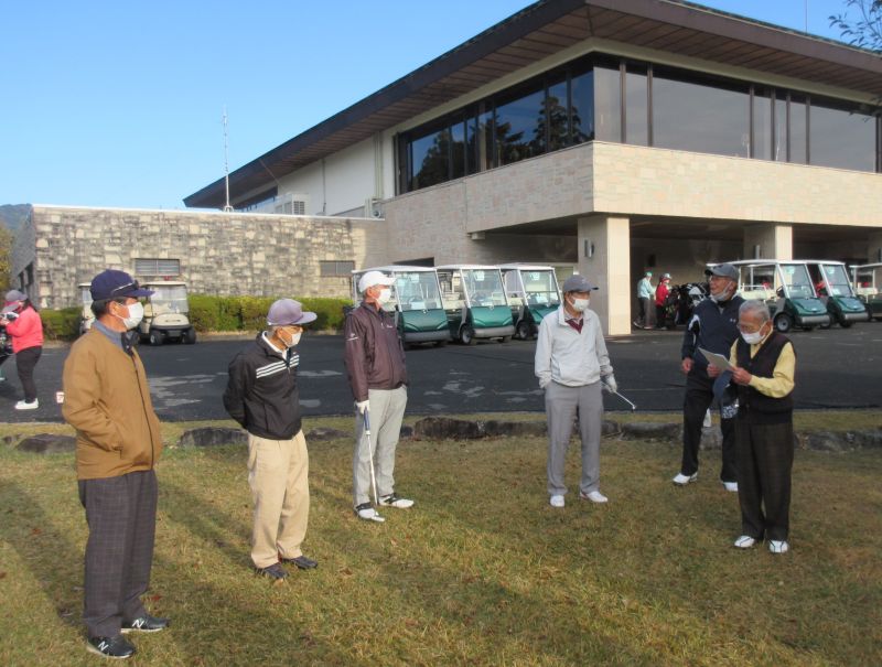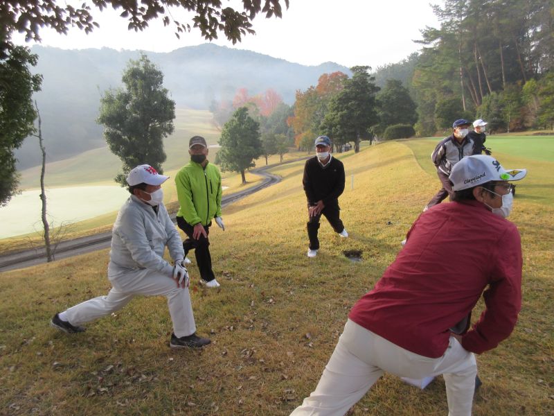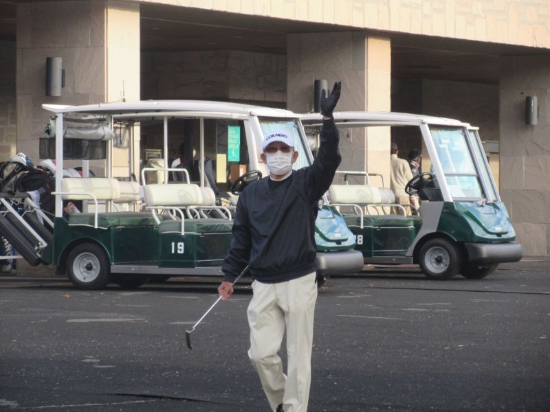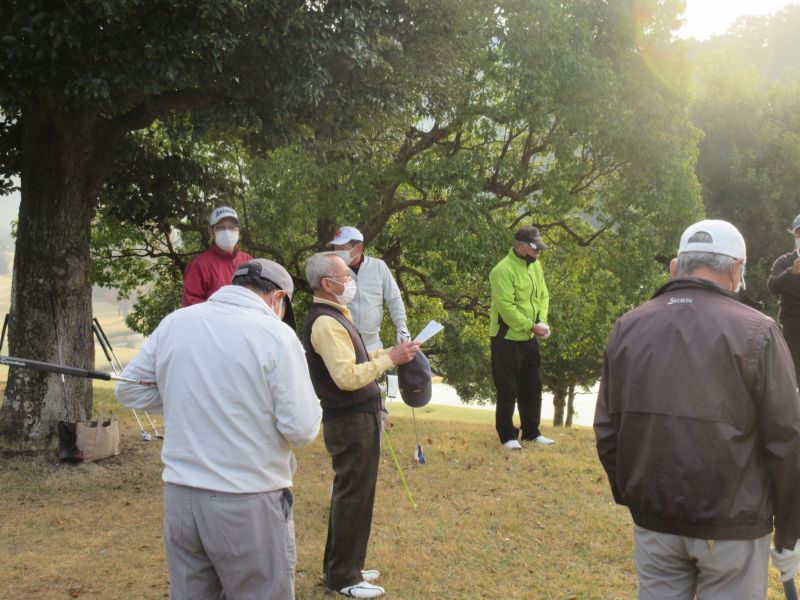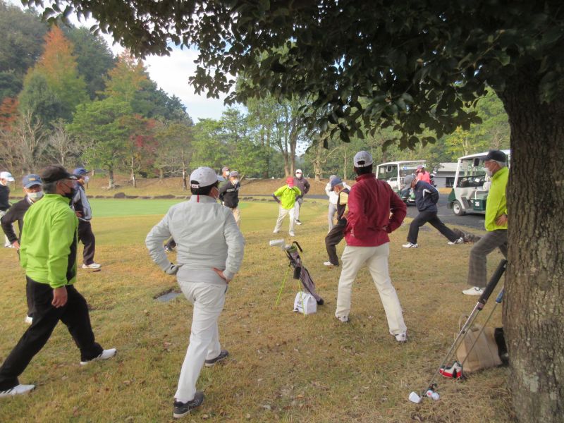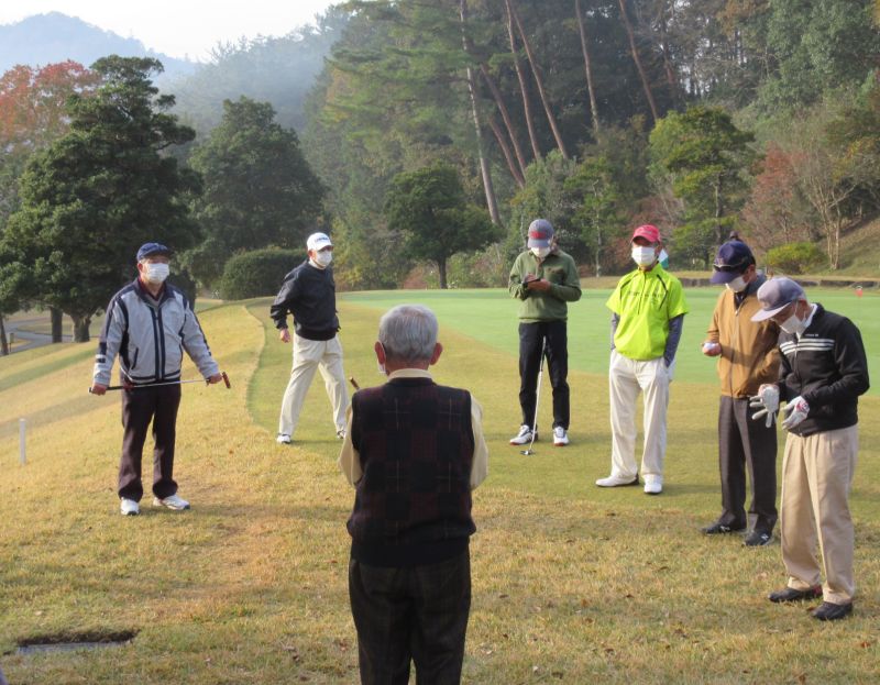 当日は文句のつけようがない好天に恵まれ参加者は笑顔で集合。今回も高木(善)さんによる会長代行挨拶を始め幹事からコロナ対策の徹底と本日の賞を披露。ストレッチ体操も入念に行い笑いの中全員でマスクを外してカメラに収まる。プレーの途中では暑い!と上着を脱ぐ参加者もいたぐらい青空が広がり風もほとんど感じないコンディションに好スコア続出!でも、グリーンのアンジュレーションに「何ちゅうグリーンや!」と、ぼやく参加者がいたのも事実。